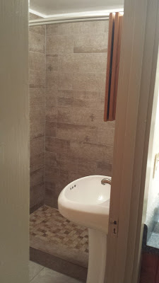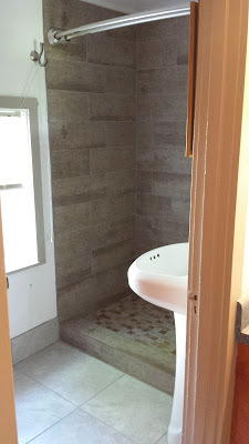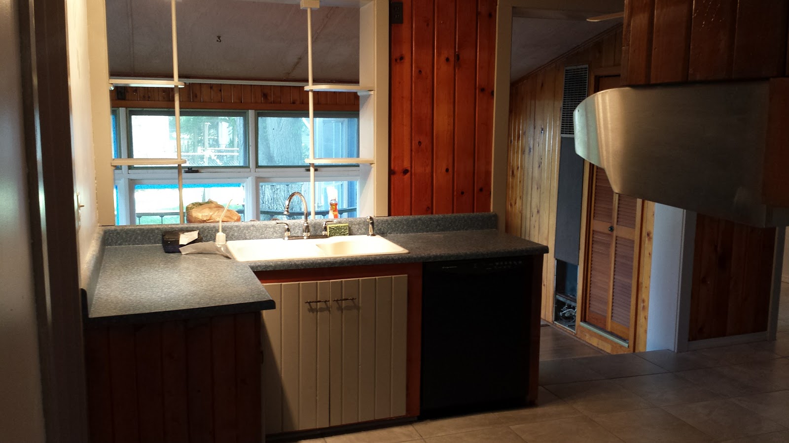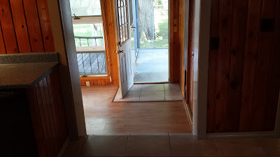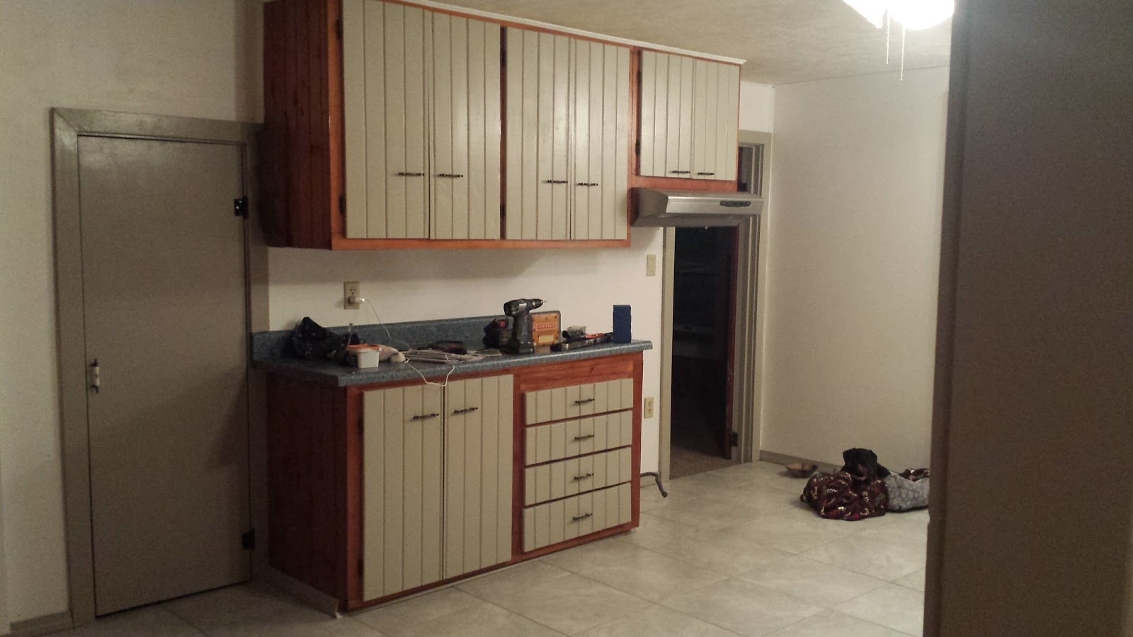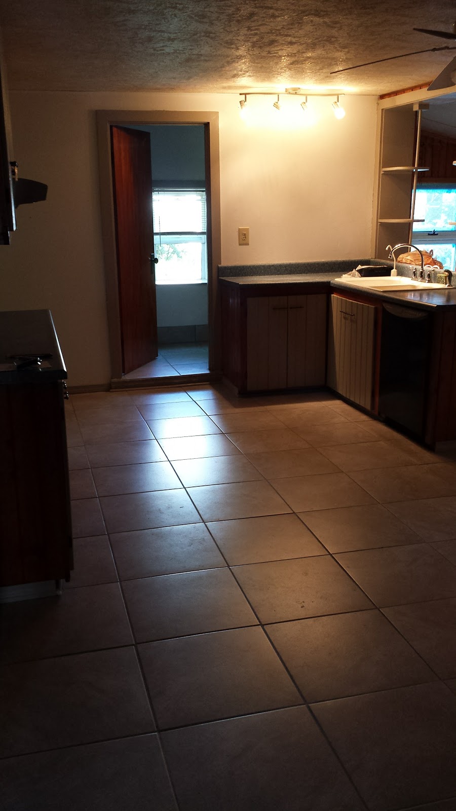 For the kitchen, bathroom, and laundry room I installed 18×18 inch tile. Next year I’m putting in black countertops with grey speckles plus a backsplash. The appliances will all be black.