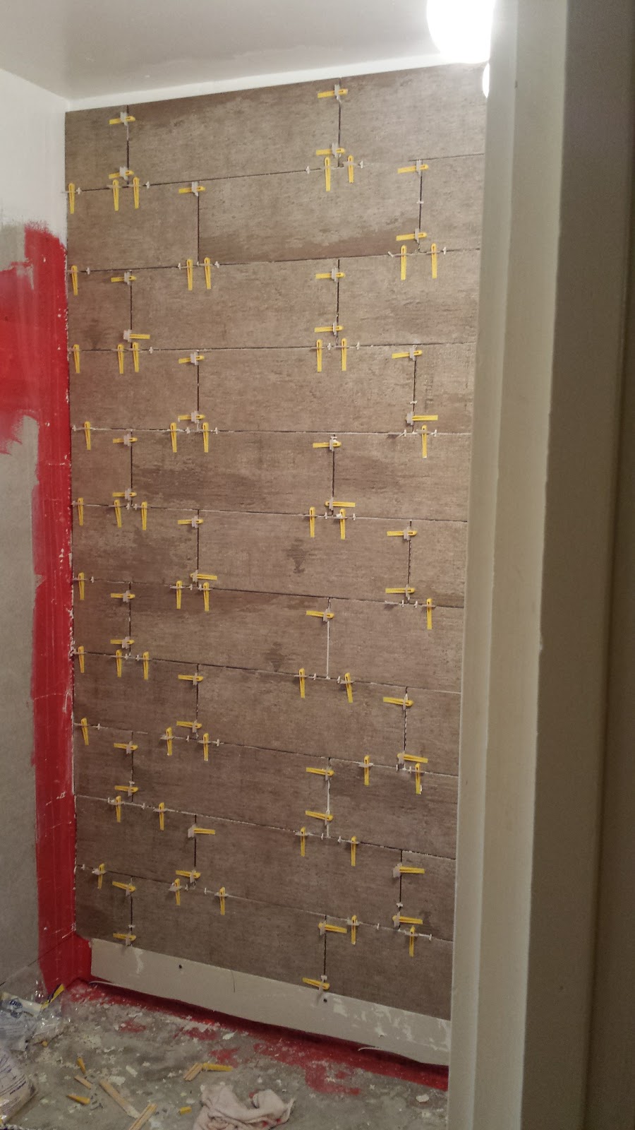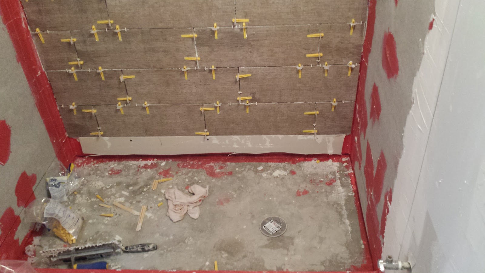 Tile the middle wall first. Don’t tile the bottom row. (I’ll explain later). I’ve used a leveling system to ensure my tiles are perfectly flat. Any imperfection will cause your shower to fail. If there is “lipage” between tiles, that’s where the water will get behind the wall eventually causing your tiles to fall off.