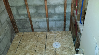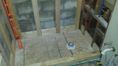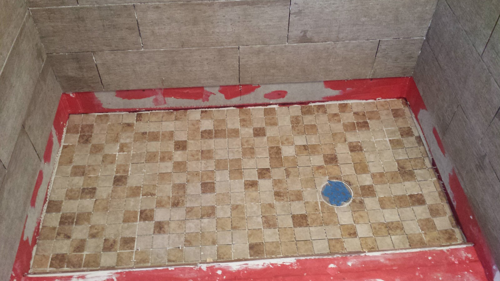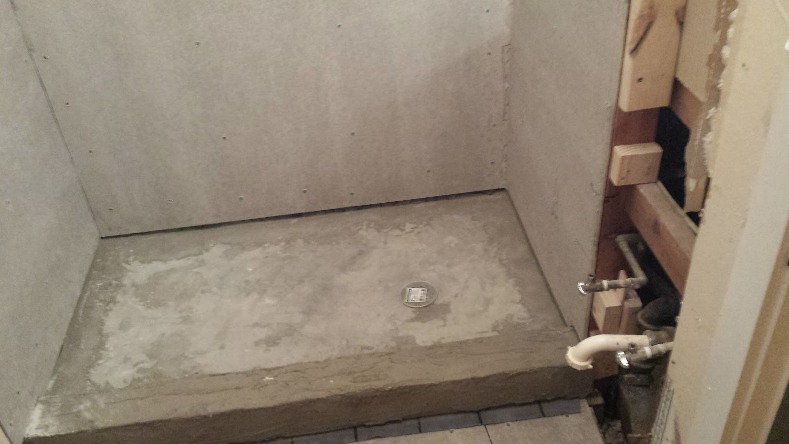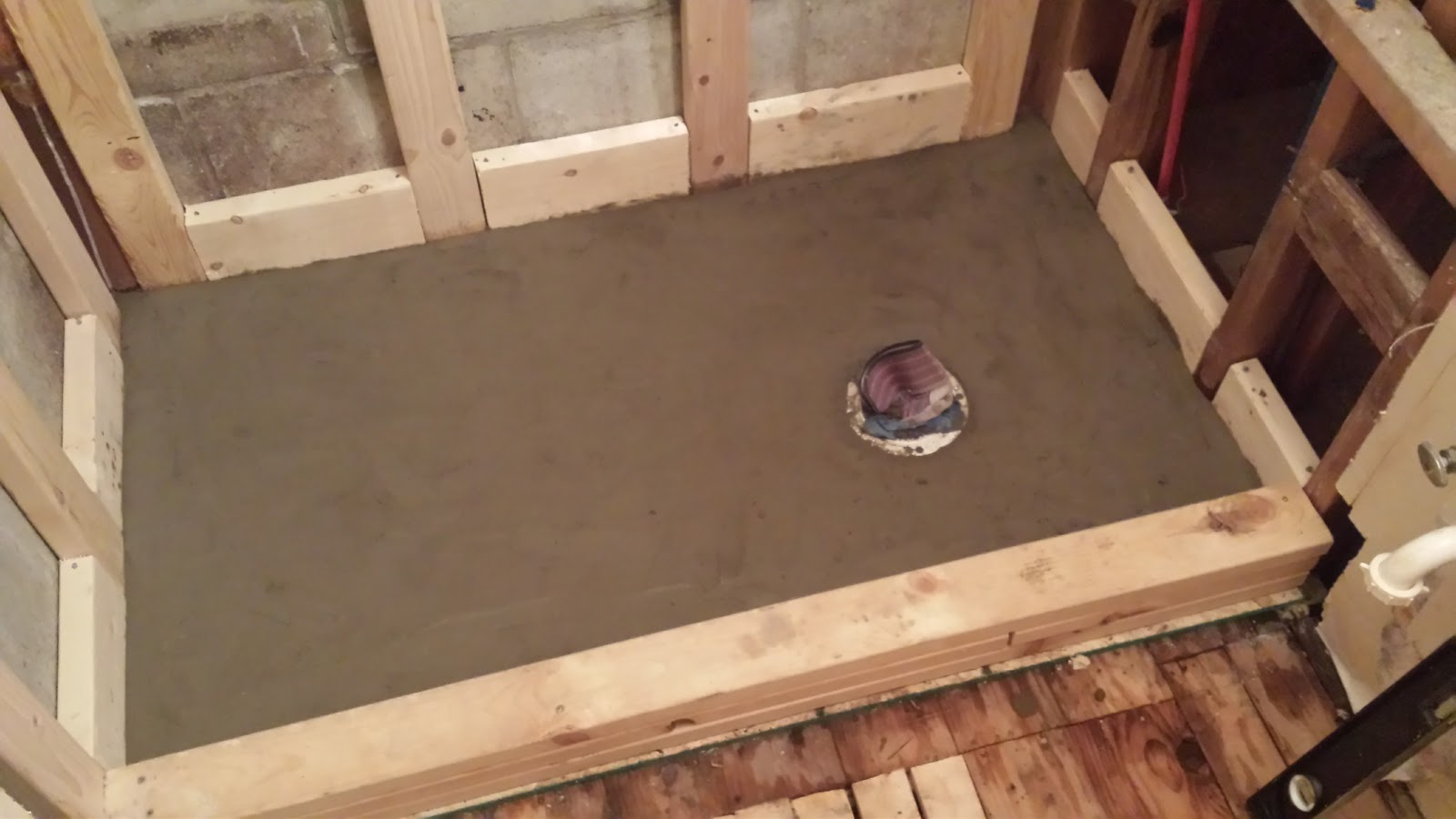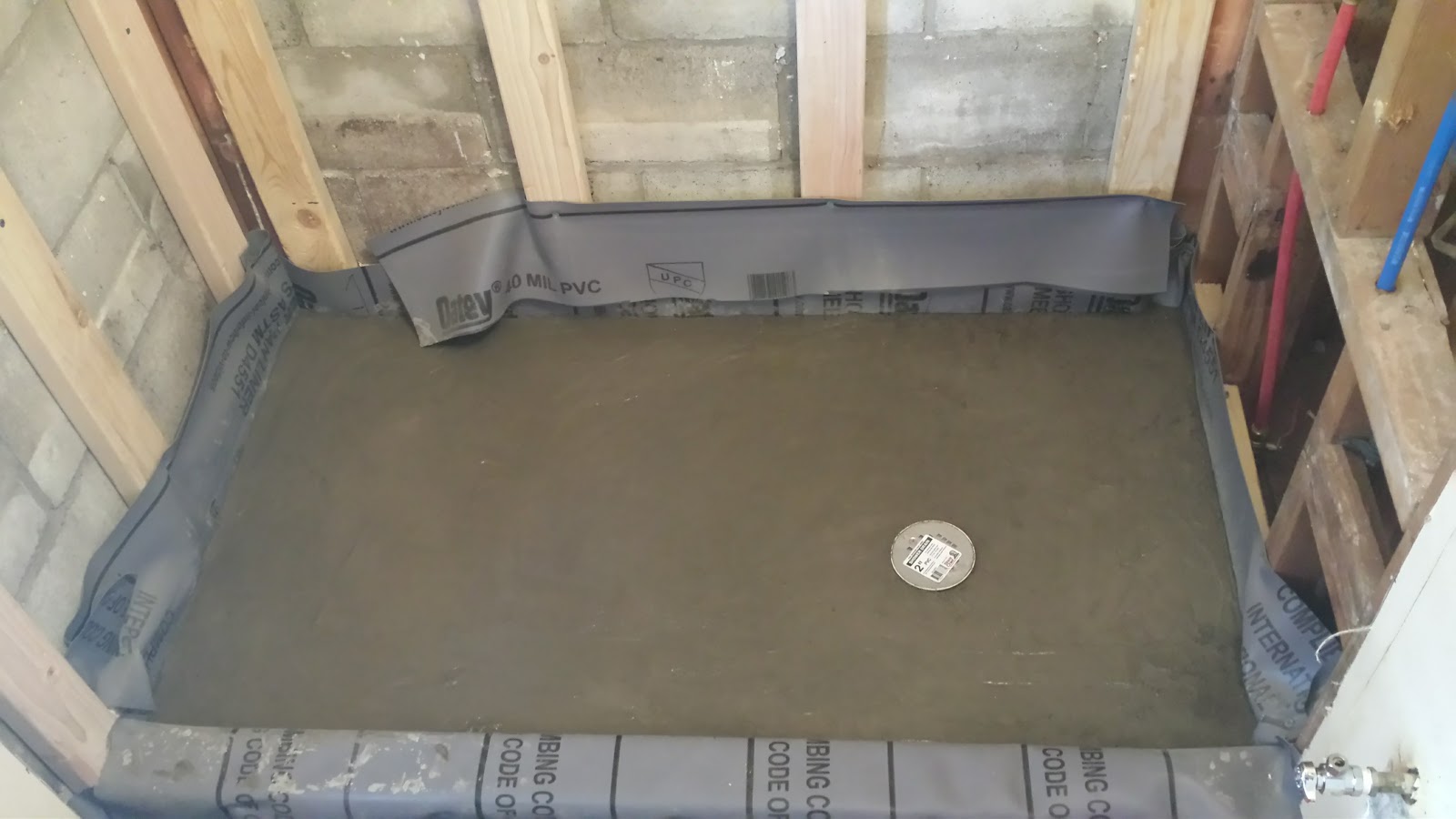 Below is the shower pan. On top of the pre-slope you install a shower pan liner. Over the liner you pour concrete and slope it 1/4″ per foot to the drain. It should be about 3/4″ thick at the drain so slope up from there.