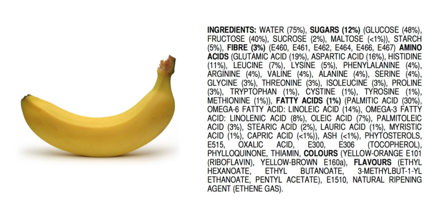 a. Appeal to scientific ignorance/chemophobia: They will list scary sounding chemicals that constitute or are used in the production of next-gen meat. Next to it, they’ll put a chunk of traditional meat and write, “Ingredients: just meat.” You’ll see memes and articles bravely proclaiming, “I’m not putting a bunch of chemicals in my body.” (Ok, stop breathing then…) This is a common strategy employed already by the organic lobby. But as you can see from the picture to the right, you can make any food sound scary to many people if you simply list its chemical make-up. You could do the same for the traditional meat.